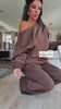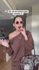 This set features a relaxed asymmetric off-shoulder top paired with matching wide-leg lounge pants. The top drapes softly with a slightly oversized fit, giving it an effortless, modern look. The pants include an elastic waistband, side pockets, and a smooth full-length silhouette.
